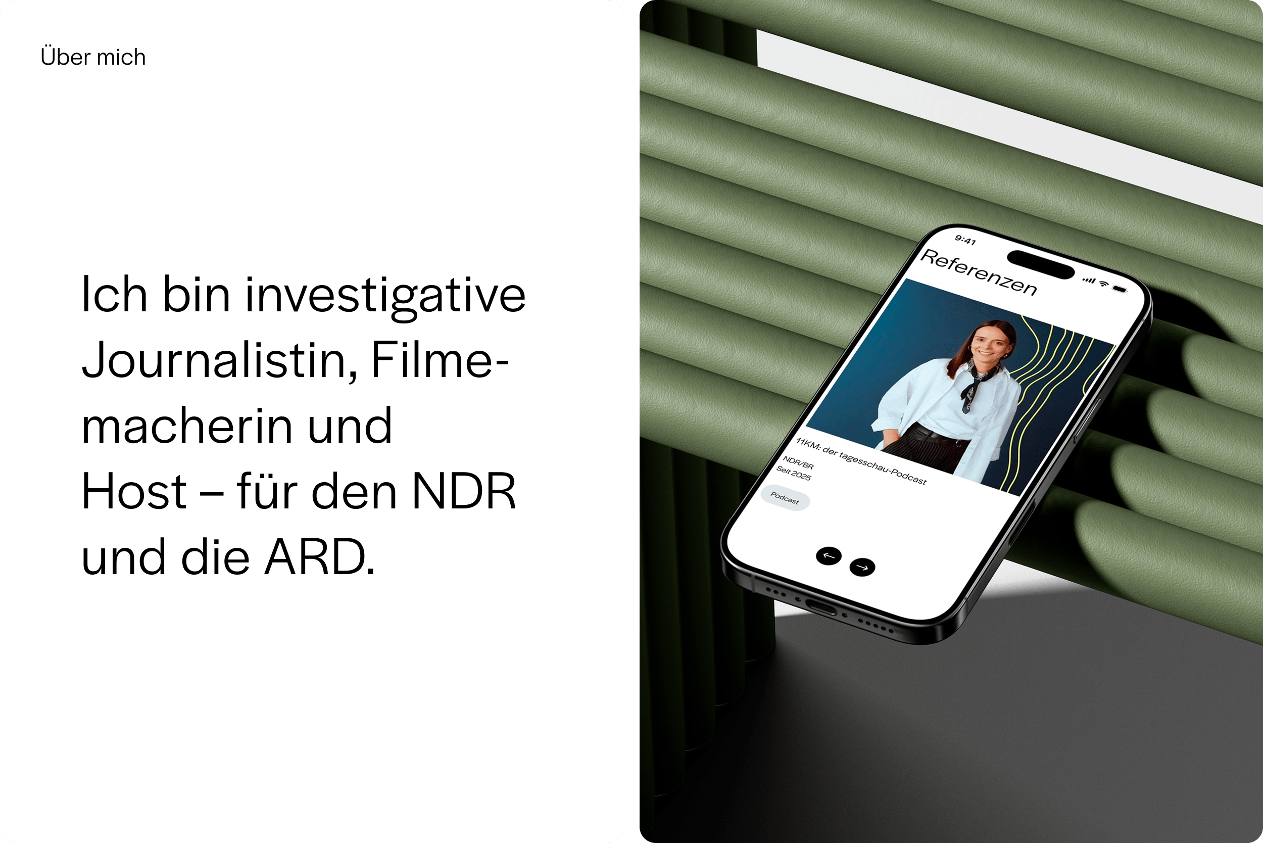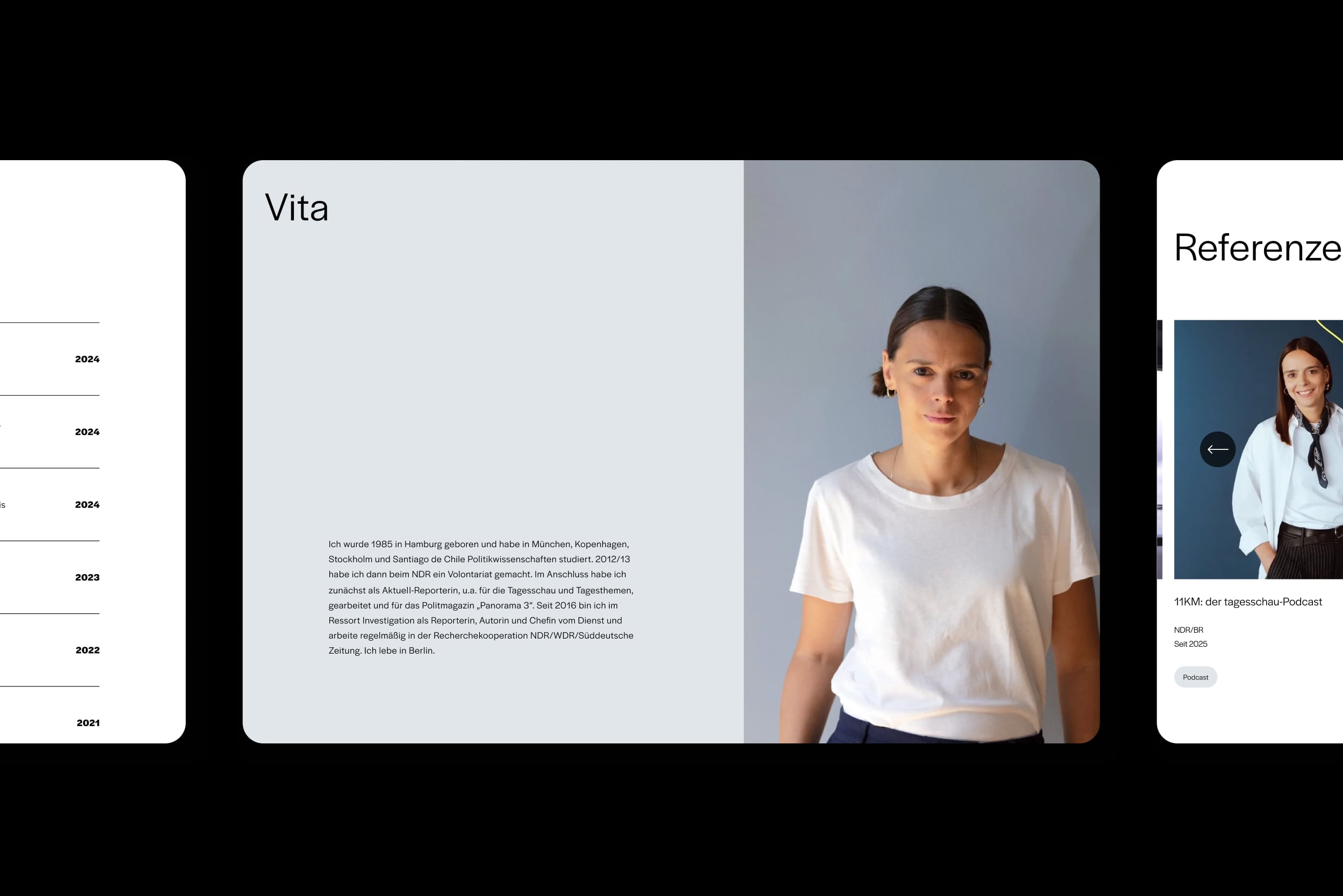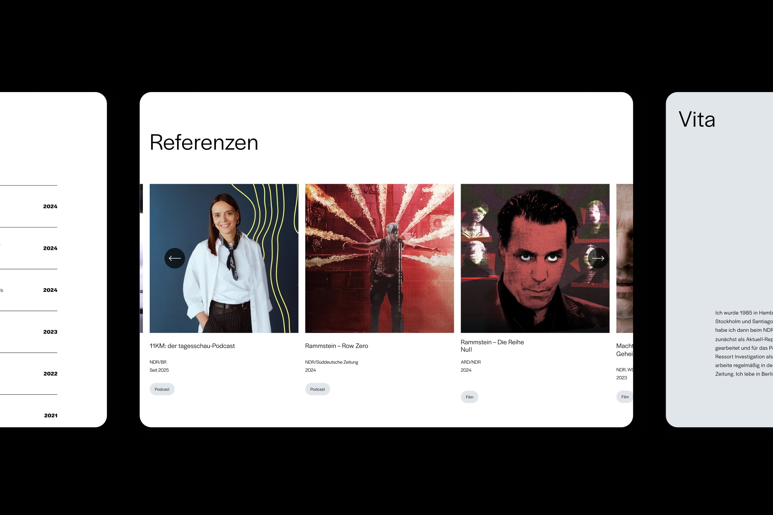 In 2024, journalist Elena Kuch entrusted me with the concept and design of her personal website. At the time, her podcast Row Zero, which investigated the abuse-of-power scandal surrounding the band Rammstein, had just been released and was receiving widespread attention across the German media landscape.The goal was to create a minimalist, clear digital presence that quickly communicates the scope of her journalistic work and numerous awards. To achieve this, I designed a clean one-page website that clearly structures her biography, projects, and achievements, while allowing her to easily update and maintain the content herself. Image credits: portrait photos: ©Omri Livne; website header image: ©NDR; all images ©Fritz Gnad ©NDR; “Der Fall Söring - Mord Macht Medien”: ©Argon Film ©CCC ©NDR; 11KM: der tagesschau Pocast: ©Monika Rasciute